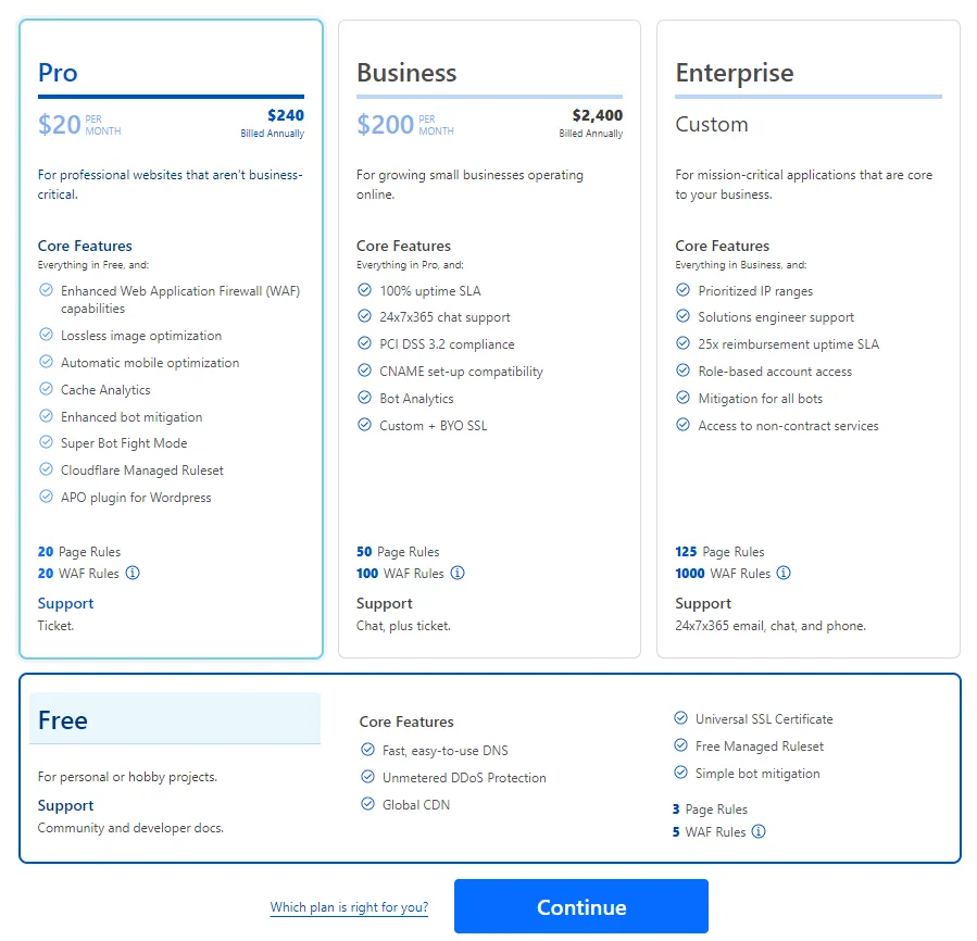 Zobaczysz kilka opcji cenowych, ale jeśli przewiniesz w dół, możesz kliknąć bezpłatną wersję Cloudflare – wybierz bezpłatną wersję, a następnie kliknij „Continue”.